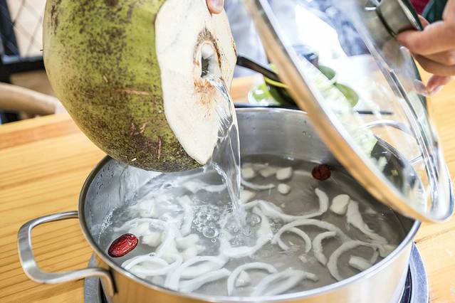 椰子鸡的精髓就在于文昌鸡和东郊椰子,东郊椰林是我国品质最好的椰子原产地,因为早晚的温差较⼤,所以糖分积淀多,椰⼦⽔比其他地区的更要⽢甜清爽一些,至于为什么我说西安吃到的椰子鸡远远不如三亚的味道,最关键的点就是在于鸡肉和椰子的新鲜度。