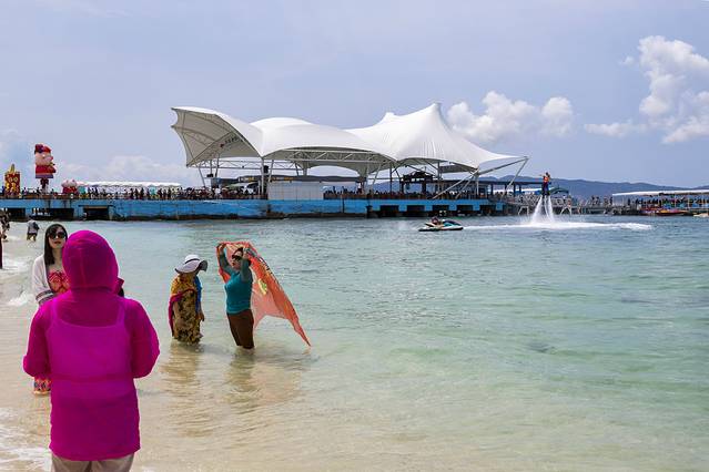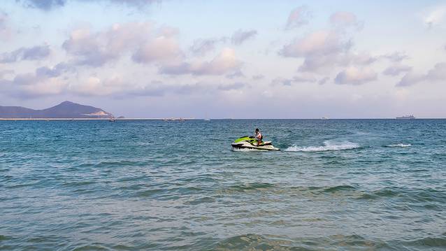 码头下来的右侧便是游玩区,水上漫步、摩托艇等常规项目便是在这里进行,岸边有沙滩躺椅和小圆屋提供给游客使用,拍照出来的效果特别好看