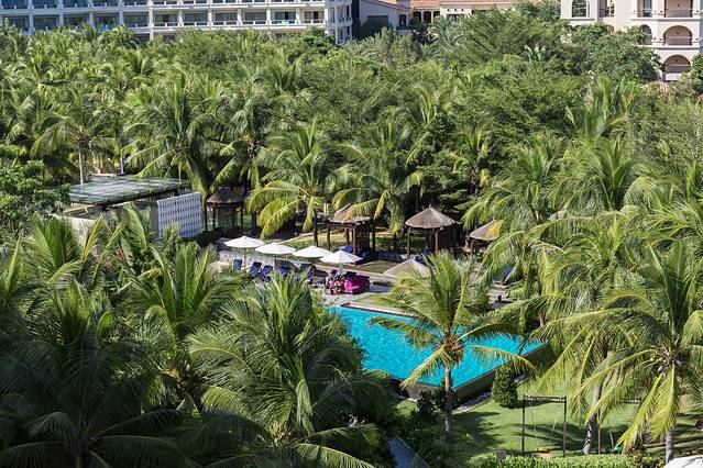 从客房看中央的泳池,隔着椰林都感受到了其美感