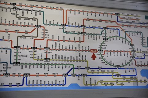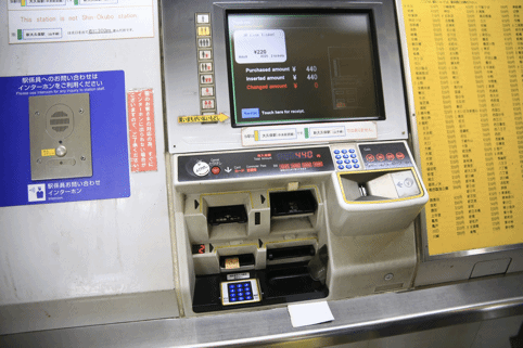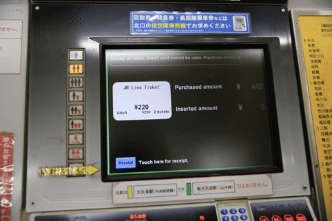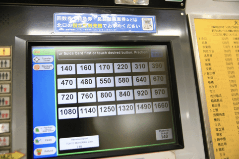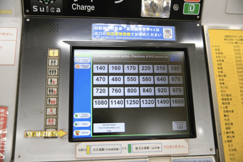 在售票机的上方有一个地铁的路线图,可以看到在每个站都有写着140、160、220、550等数字,这些都是从现在所在的站到相应的车站的车票价格。日本的地铁售票机和国内最大的区别就是,国内购票时只需要选择好终点站,机器就会自动计算好价格,我们需要做的就是付款-取票。但是在日本,机器是不会帮我们计算票价的,我们需要自己看着上面的这个路线图计算好价格之后,投入相应的金额才能购买车票!!!