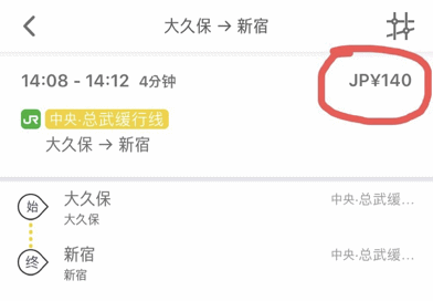 可以看到,红色圆圈标注的地方就是从大久保到新宿所相应的票价。使用这类地铁软件可以节省我们很多的时间。