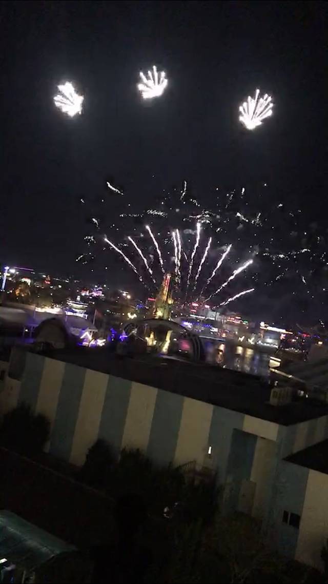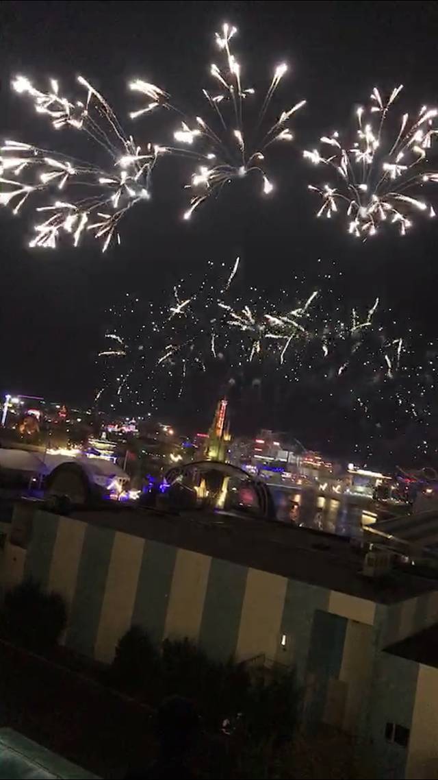 坐在卧室沙发上看着巡演和烟花!吃着水果!我们觉得很满足!这一天累到腿疼!真的走不动了!