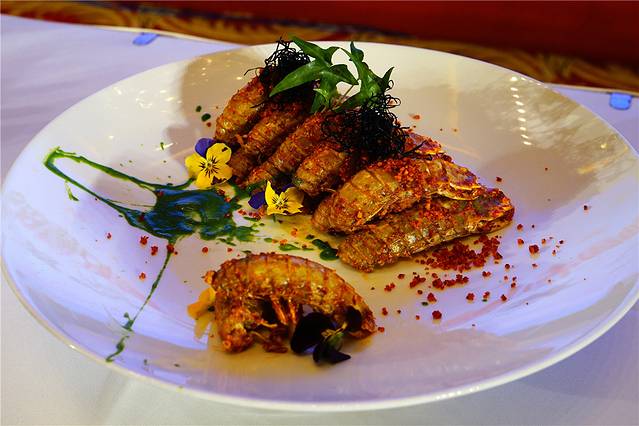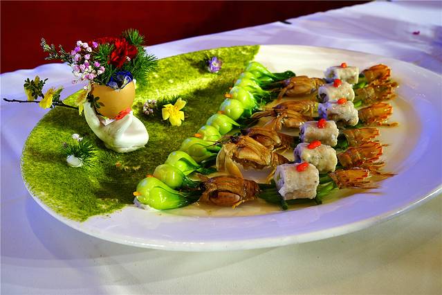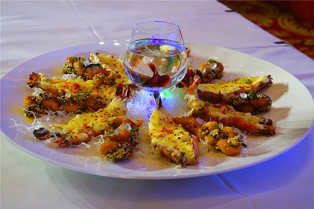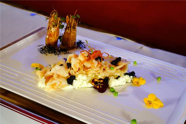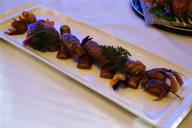 再看看那相亲相爱的大对虾,摆上擂台的有中看又中吃的“情侣虾两吃”;有带着西式洋餐痕迹的“芝士芥辣焗对虾”;还有精美标致的“松露芙蓉敲虾片”。