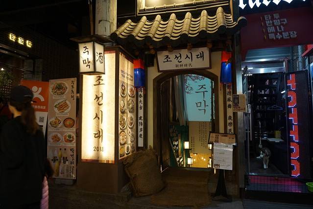 晚上当然也要待在弘大了!弘大的夜晚是出了名的热闹啦。我们还找了一间酒吧小酌一下,店内氛围也很好,弘大的街头也有不少好看的小哥哥小姐姐表演哦。(酒吧:朝鲜时代,推荐米酒)