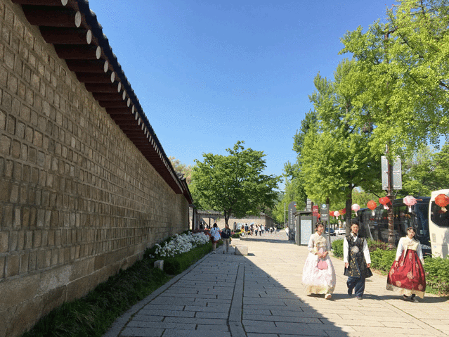 我本身就是一个对城市的老建筑、历史建筑颇有兴趣的人,所以景福宫这样的历史见证,远比南山塔要吸引我的多。第一站,景福宫!安排!那如何才能更融入其中去感受这里的历史韵味呢!经过本人亲身体验,穿上一套韩服逛景福宫绝对够值!一来,可以尽情地拍拍拍,在景福宫穿韩服拍照绝对比穿日常的现代服饰要有趣得多,二来,穿韩服参观景福宫,还能免去门票费用!所以绝对值得一试!这时候的天气微凉!拍韩服更自在了!(我们去的那家是在北村,价位大概是20000韩币/两小时)