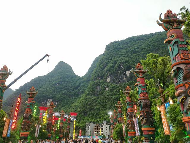图腾古道位于阳朔著名的“十里画廊”中的位置。距离桂林不算远,景区展出的有石器、陶器、自然图腾柱、古老的弓弩、让人听不懂念念有词充满野性诱惑的肢体语言等原始生活场景,再现了12000---7000年前桂林先民居住、生活、宗教、狩猎和甑皮文化的历史风貌,为世人开启了一道远古之门!
