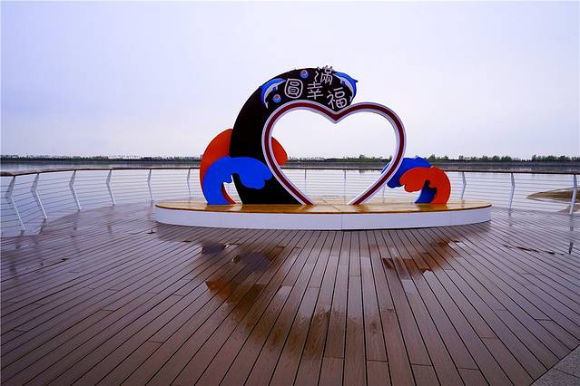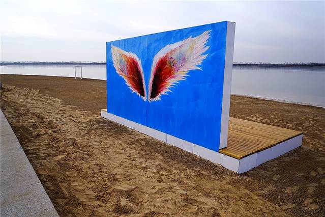 海岸边上巨大头饰的背景墙吸引着人们好奇的目光,人站在墙下来一副自创画像,很有意思。一扇半开的门,你是走进大海?还是返回沙滩?一面心形背景墙,自然是充满浪漫的情侣们合影留念的好地方。假以时日,这里一定会成为少男少女们争相而至的拍照打卡区。