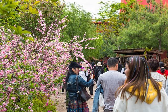千古情景区里的花儿开得正盛,游人纷纷自拍合影。