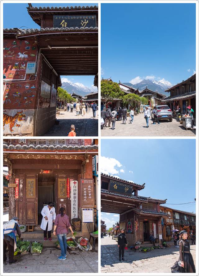 白沙古镇牌楼里的墙上,是形象生动的东巴文字。牌楼旁,当地的农户卖着新鲜的蔬菜,生活气息十足。