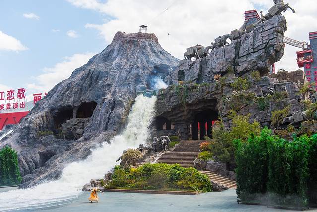 千古情景区内,有从云南偏远乡镇运来的古老木屋建筑群,这是经过岁月洗礼而留下的斑驳。街道也是作旧风格的石板路,整个园区的绿化做的很到位。碧绿的草地,艳丽的鲜花,是最美的自然。