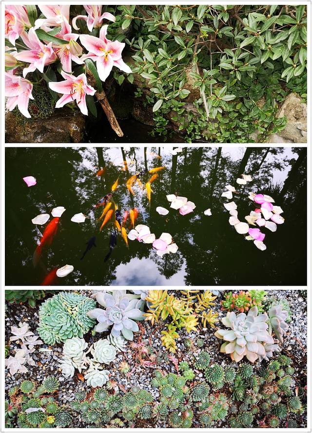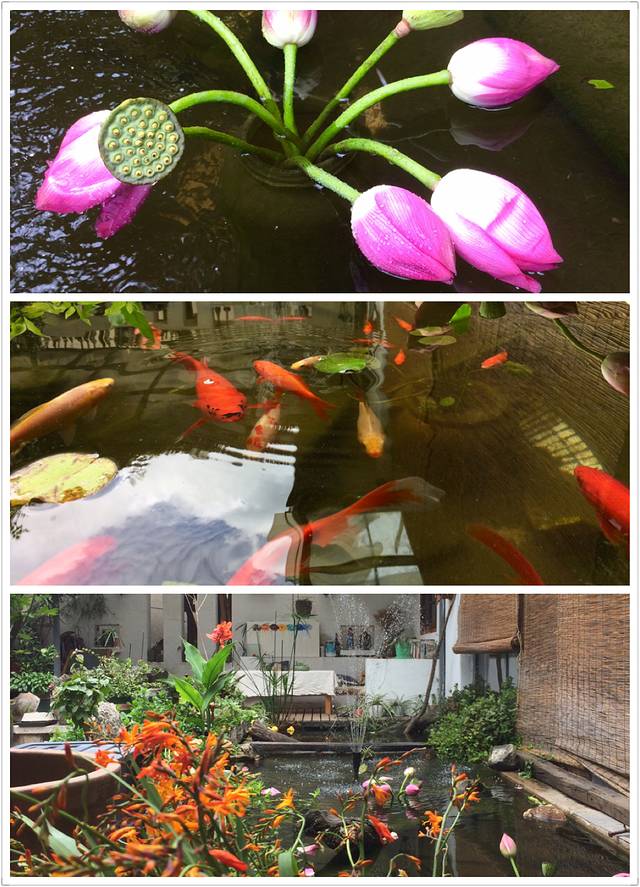 从楼上俯瞰,是个舒服的院子,花草茂盛生长;鱼儿在池里恣意地游走。