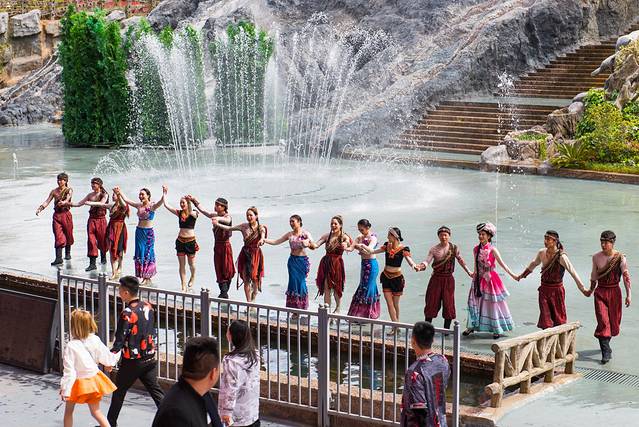 游客们按照秩序从室外演出场地退场,并进入千古情景区内。