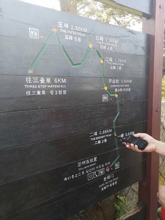 研究这个图也没有用,还是赶紧出发吧!从五老峰入口到一峰一路走走停停,虽然也有点高度,但似乎也比较容易的到达了,一峰到二峰、三峰、四峰从图上看就不难,基本上也是轻轻松松。四峰到五峰是先下行再上行,并且上行的坡度还没有一峰高,所以经我们实地勘测其实是一峰较难爬吧!