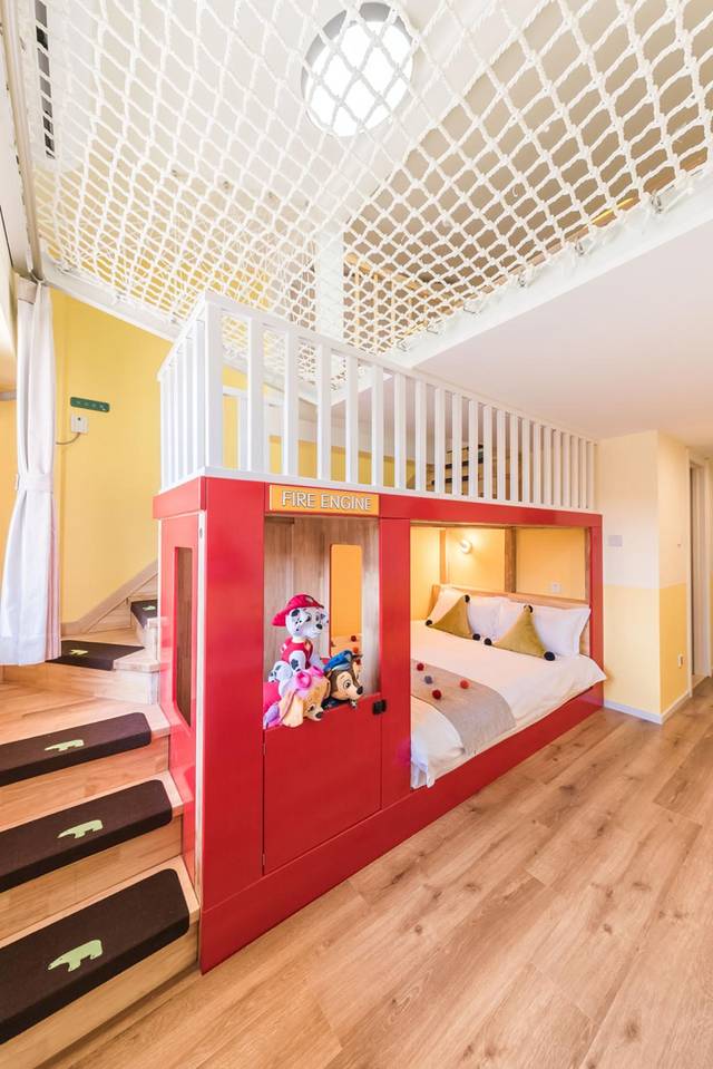 到了第二楼,就是为客人们准备的温馨起居室了。配备了两个大房间,而每一个房间又是各有一片天地。一进入门,原来是汪汪队!它们已经坐在床上静候着小朋友的到来了!