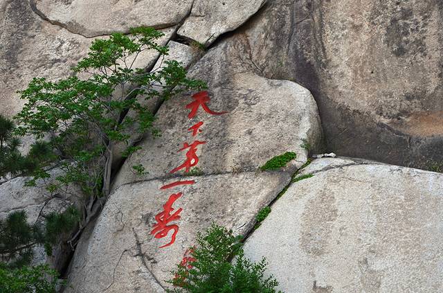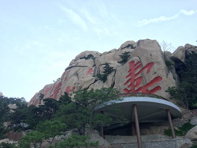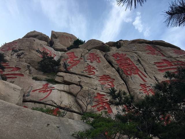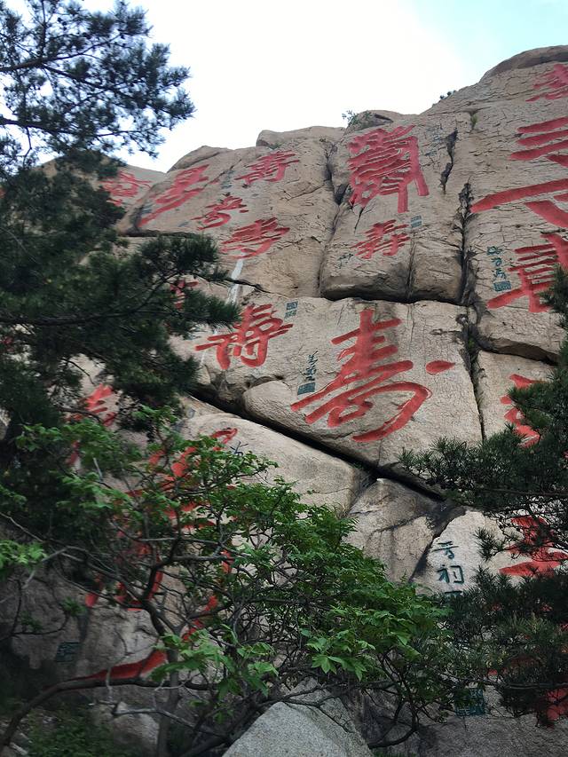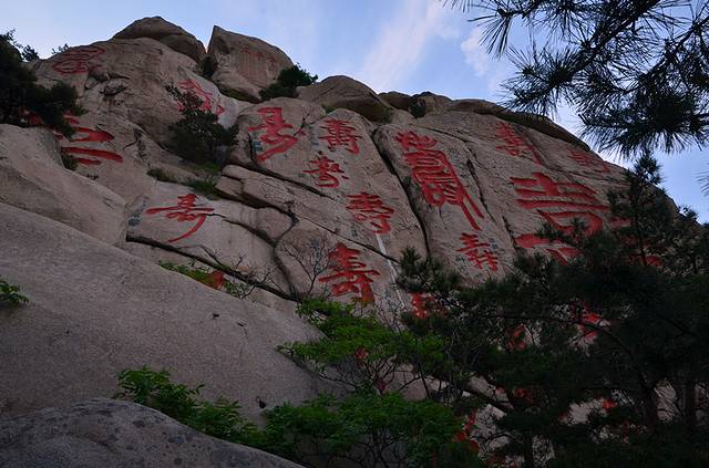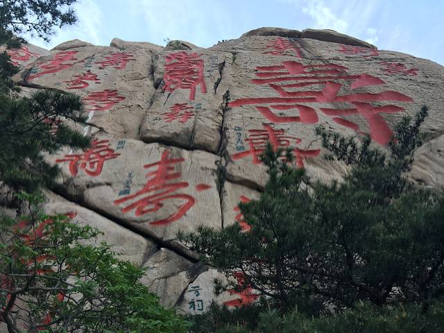 山东崂山仰口风景区寿字峰,位于青岛崂山仰口风景区的上苑山,在两万平方米的石壁上刻着40余个“寿”字,最大的高38米,宽27米。