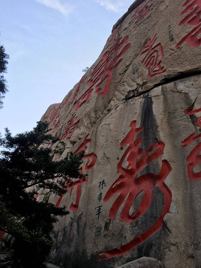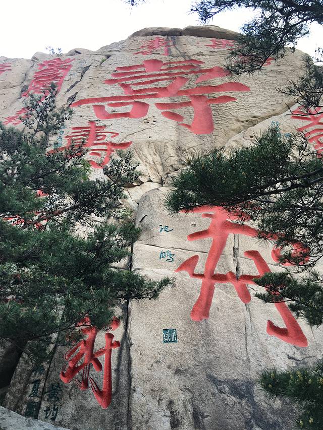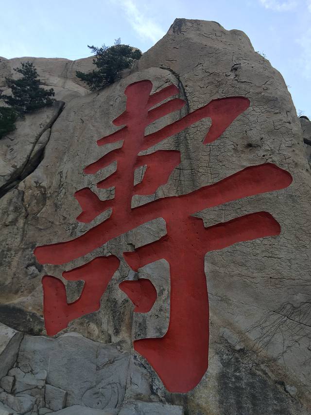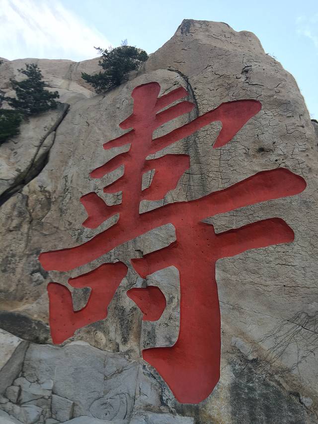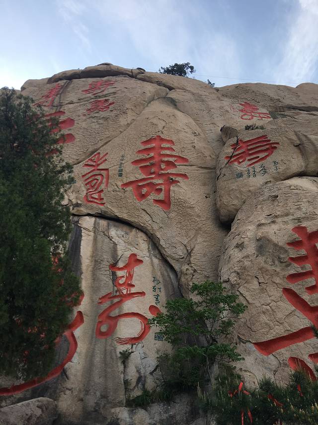 “寿"字峰,大大小小寿字40余个,隶、篆、行、草、楷多种字体构成“多寿图",最大 寿字高约38米、宽27米,被誉为“天下第一 寿"。
