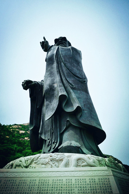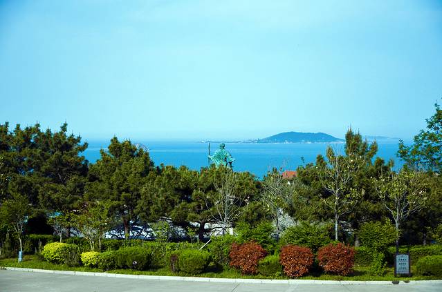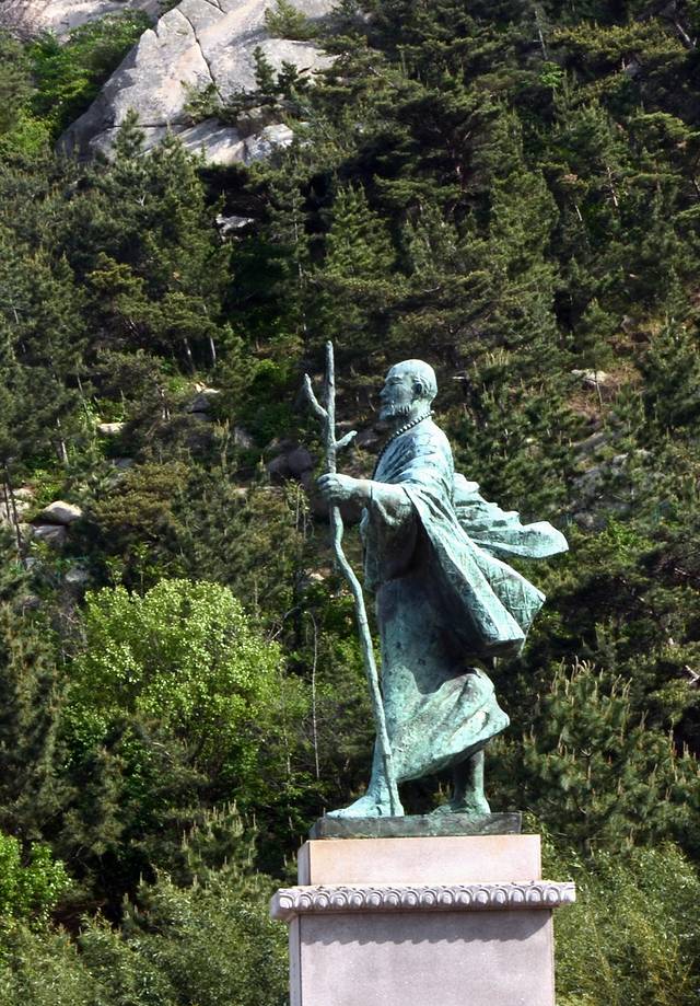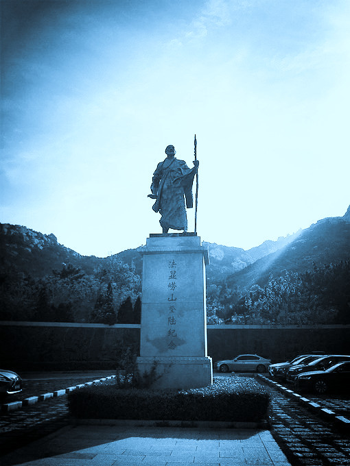 山下广场,塑有一座铜制雕塑,纪念法显从古印度求法归国在崂山登陆的历史往事...