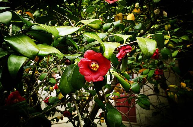 山茶花,也叫“耐冬花”,开在冬春之际,花朵大而艳丽,凋谢时,整朵离枝落下。在寒冷的冬天,众花寂寂,惟有山茶“雪里开花到春晚”,难怪有人说,茶花傲比寒梅,艳凌牡丹,“耐冬”之名由此得来。