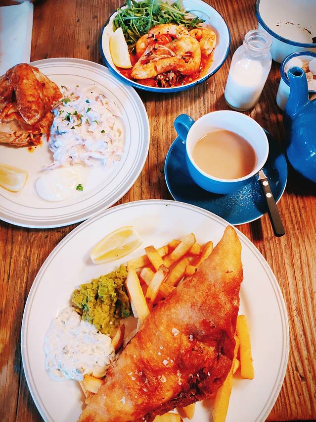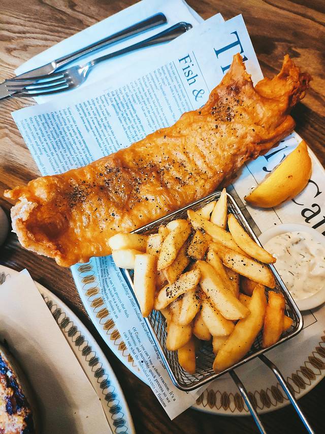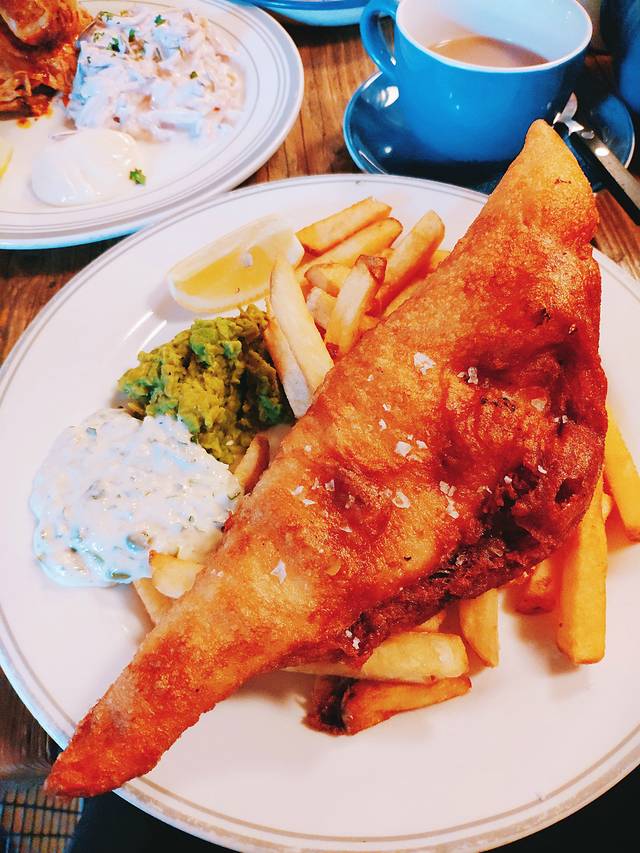 「炸鱼薯条」即将离开英国,打算再吃一次炸鱼薯条作为告别~这家的炸鱼薯条配了豌豆泥,鱼虽然不是很厚实但是够嫩~薯条很香很酥脆,就是价格小贵,16胖子~