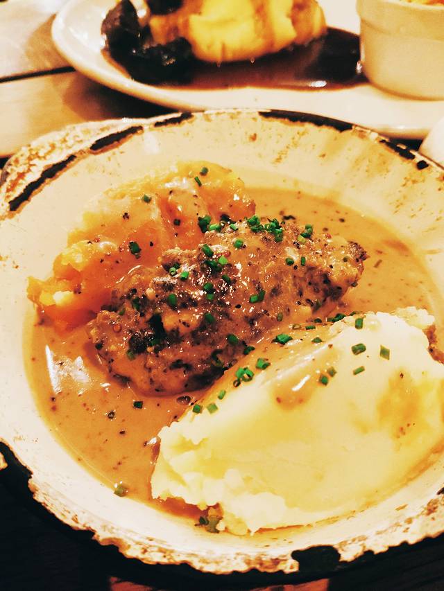 一眼看中了菜单上的#mini haggis#,同样是土豆泥、羊杂碎、南瓜泥的组合,小份的既可以尝鲜又不会腻~味道呢,完全吃不到膻味,口感非常非常细腻,跟土豆泥南瓜泥一起吃,入口即化~不难吃,但mini份的大小也足够尝鲜啦~