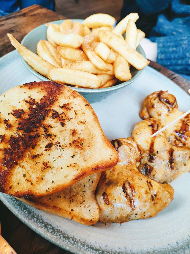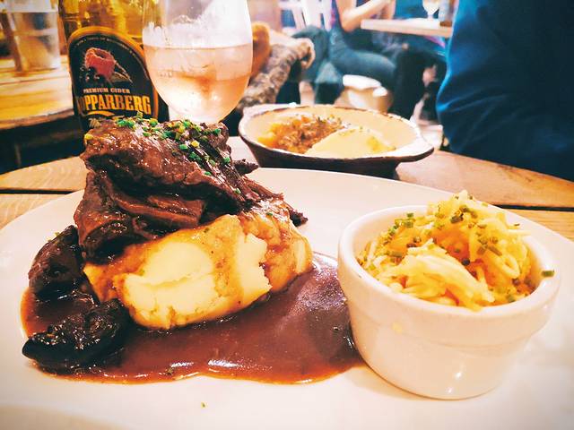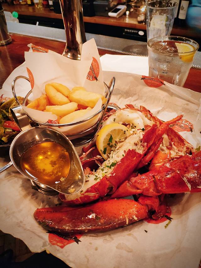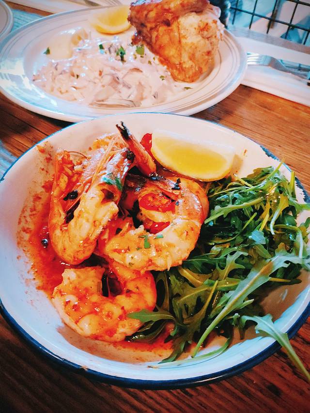 「蒜汁黄油蒸龙虾」两个人点了1.5镑的,一个龙虾对半切,外加一小碗沙拉、薯条和一杯鸡尾酒,算是超丰富了~第一次吃garlic butter的做法,还没吃就已经闻到扑鼻的香味。吃到嘴里更是鲜嫩滑弹,鲜美无比。身子上的肉吃完再吃爪子,爪子上的肉也超级多~值得一提的是,配餐的薯条超级好吃,很绵密的粗薯~
