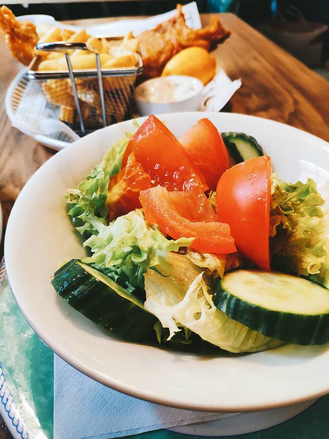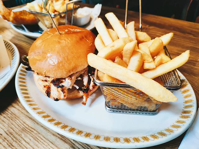 「鸡肉汉堡配沙拉」因为牛肉吃太多,所以点了original chicken burger,于是踩雷了……一整块儿非常柴的鸡肉,毫无味道地烤制完放进汉堡里……后来干脆把鸡肉拿开,把鱼派里的鱼肉夹进去吃,算是蛮惊喜的补救~配菜的沙拉就是普通的在国内值不了2块钱的蔬菜,但这里卖4镑多,摊手~