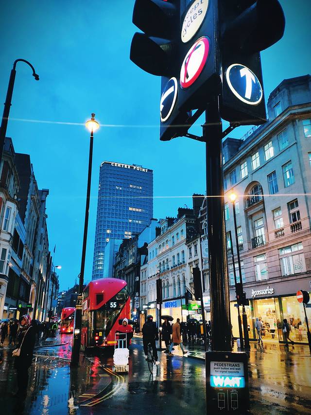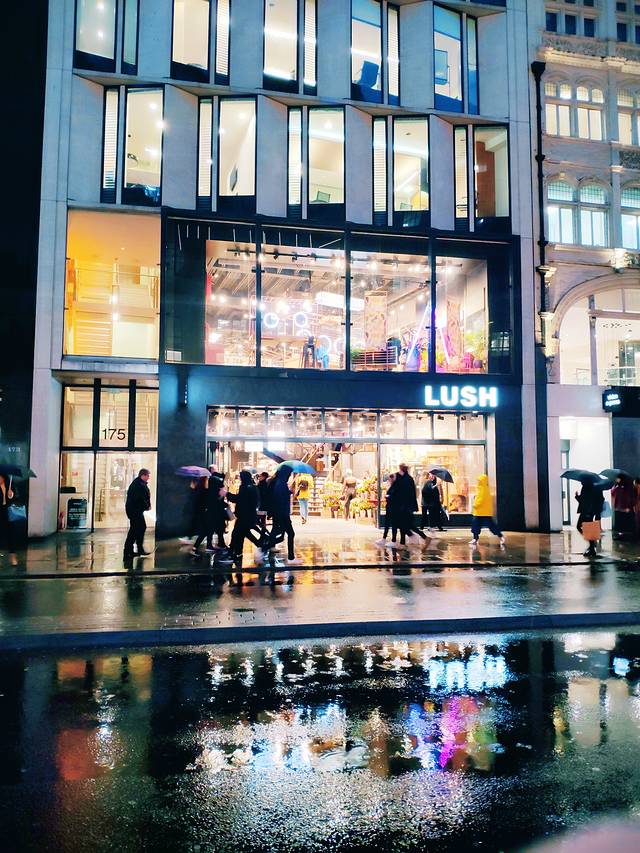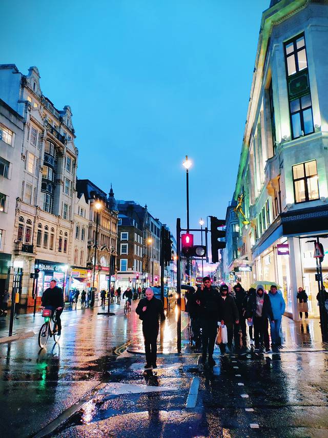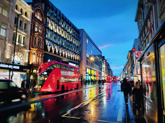 牛津街是到英国伦敦首选的购物街道,云集了超过300家的大型商场。其中,老牌百货店SeIfridges也在这里。可惜,对购物完全不感冒的我俩,并没把重点放在这里,只是匆匆打卡。从大英博物馆出来后,狂风暴雨。顶着大风走在牛津街,华灯初上,竟发现雨中的伦敦也美得别有一番滋味……