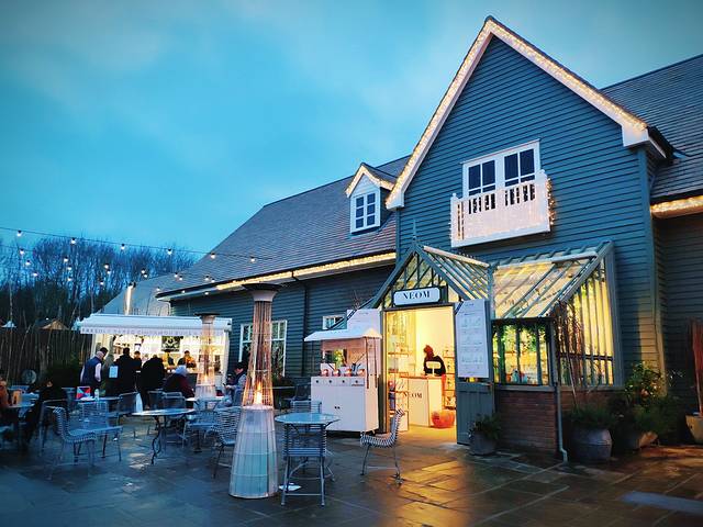 比起品牌,我们更惊艳于它的氛围。童话般的小白房子,在青得透明的天幕下,梦幻得不真实。随着夜幕初上,更加梦幻的小串灯一一点亮。比起一个扫货天堂,这里更像一个童话小镇。