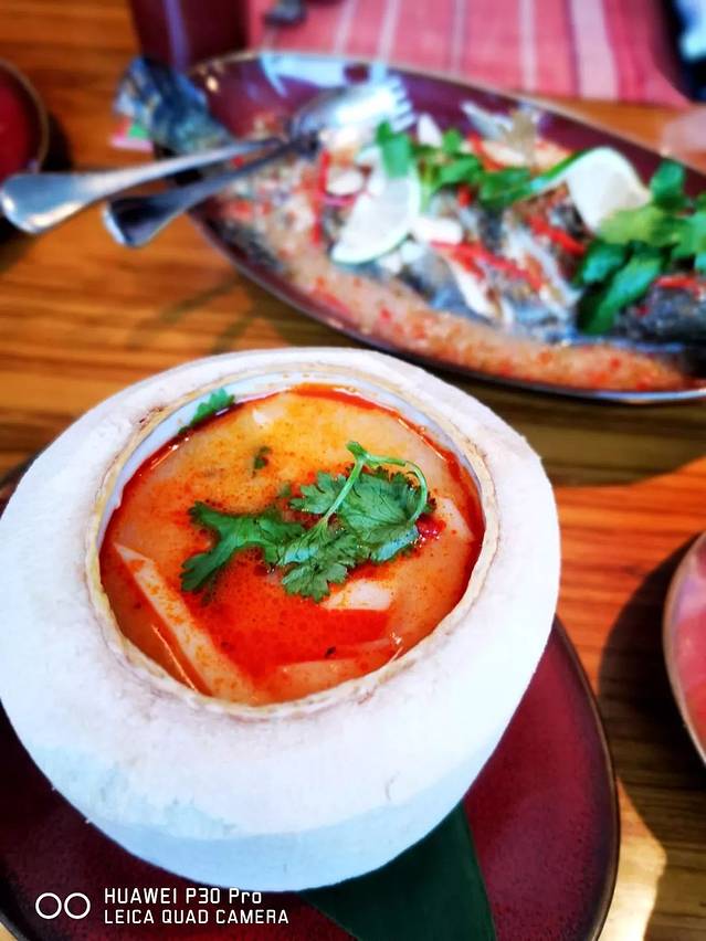 逛了一早上,回酒店让爸爸休息一下,中午带他吃一次泰餐。在厦门瑞颐大酒店的二楼红泰餐厅,可是一家被泰国厦门领事馆认证过的。餐厅装修很别致,充满浓郁的泰国风情。餐厅提供的菜品有我喜欢的椰奶冬阴功汤,青木瓜丝,芒果糯米饭,泰式柠檬鲈鱼,好看又好吃的宋干饺子,班兰炸春鸡,味道地道,误以为是在泰国吃美食。