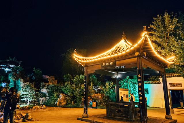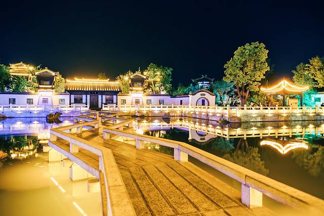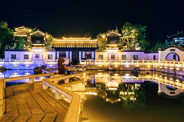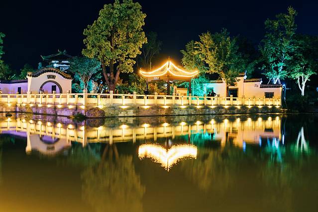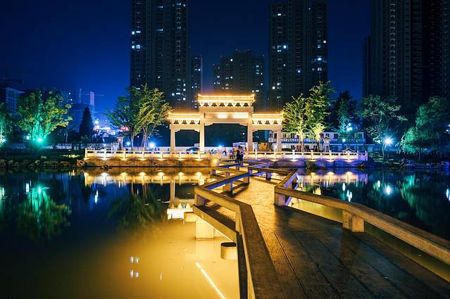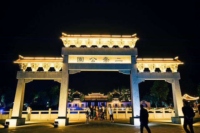 二乔公园与以往游览过的公园没有太大的区别又似乎有着很多的不同,这类确实如很多人说的那样,二乔公园真的如“二乔”一样的美,入口处简介的牌坊,三国的建筑倒映在水中尽显的很是柔美,特别是在夜景。曲桥横跨于水面之上,仿佛这就是那条穿越的时光轨道。百看不厌的白墙灰瓦,亭台楼阁轩榭廊,在夜色和灯光的衬托下彰显的更加的古色古香。