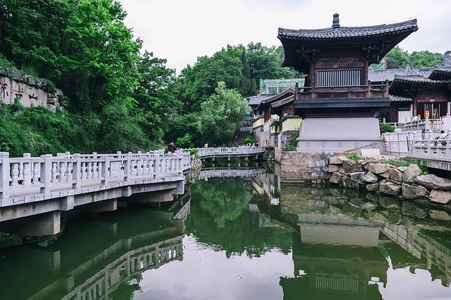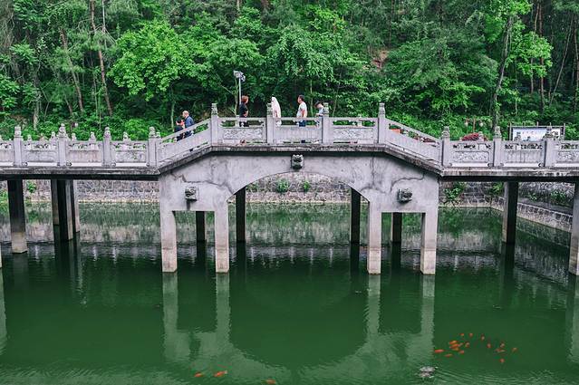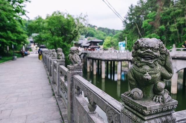 山谷流泉摩崖石刻文化园就位于 天柱山 脚下,前往山谷流泉文化园的途中,我们首先会经三祖寺,三祖寺的前面是一座很是漂亮的石桥,也是可以通向山谷流泉的路,水池偶尔还会有小鱼儿悠闲的游来游去,护栏上全部都是用石 狮子 做装饰,细心的发现每一个 狮子 的造型皆不相同,栩栩如生,神态逼真。