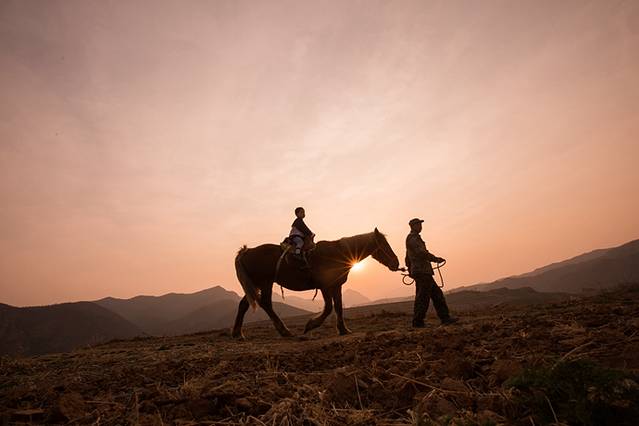 牛师傅带着我们一起喂马吃草,带他饮水,和两匹马慢慢熟悉后,我们还用刷子给“闪电”刷毛,夕阳西下,牛师傅牵着马带我们看夕阳,一天的小日子悠闲的让人羡慕。