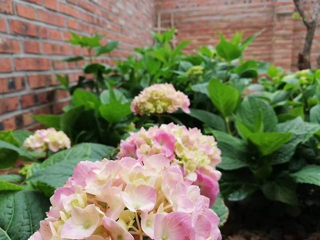 院子里摆放着晒干的玉米,作为院子内的装饰物,小院里还种有粉色的绣球花等绿植,让人觉得一切都充满生机。
