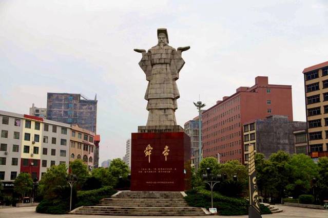 在一处路中间的转盘上看到一座雕塑,停下车来看,原来是舜帝雕像。雕像有三四层楼那么高,是用一块块花岗岩垒起来雕凿而成的。只见舜帝头戴王冠,双手掌心向上,似在祈求上苍,保民平安。雕像的基座上刻着《史记》中写的一句话“舜南巡狩,崩于苍梧之野,葬于江南九嶷。”