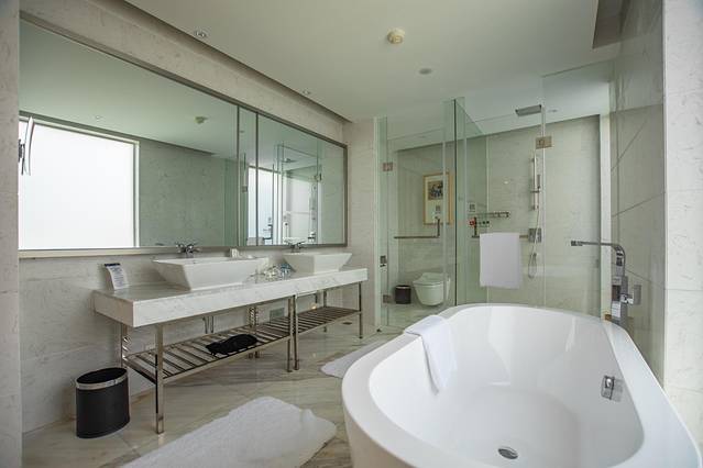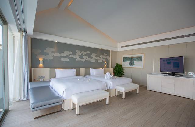 亚龙湾迎宾馆的海景泳池别墅是近两年是打造的客房产品,所以装修和设施都很新。我们入住的海景泳池双床别墅里,有一间主卧、客厅、衣帽间和洗浴间。在洗浴间内,是分离的干湿区、浴缸和宽敞的洗漱空间。