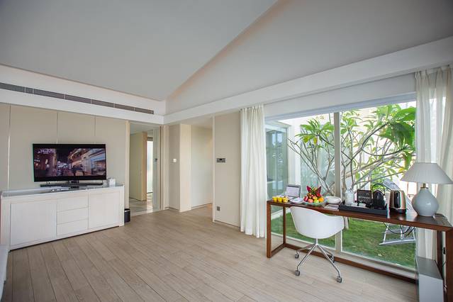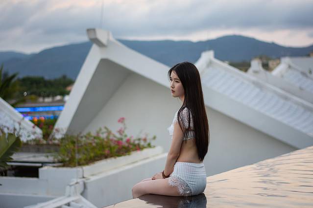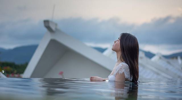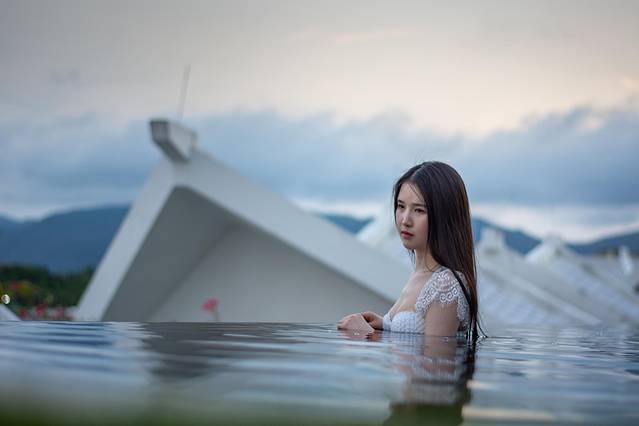 当自动化的窗帘被智能唤起,推开房门向外,就是泳池。泳池不深,就算是不会游泳的人在里面也是绝对的安全,如果你真的和我一样不会游泳,其实可以在黄昏之后去泳池里泡去身体之上的汗液。当然,泳池绝对是一个拍照的好地方。