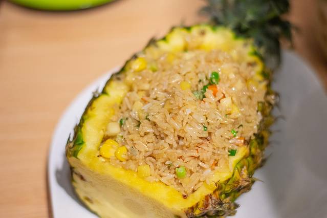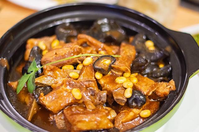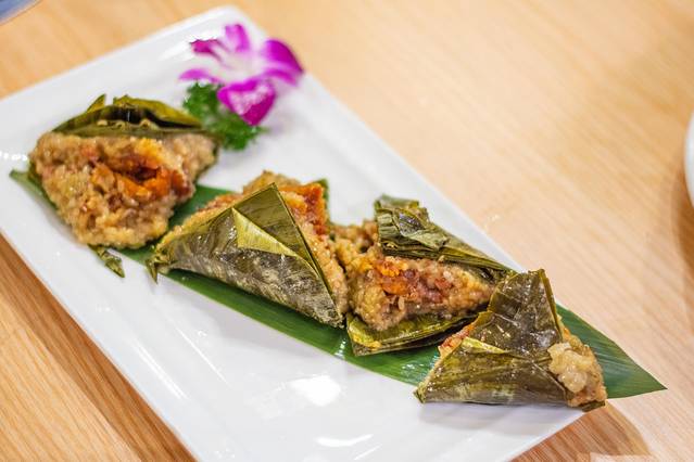 除了原汁原味的椰子鸡汤锅,餐厅里还有一些熟食和主食可以选择。其中比较推荐的是海南黑猪肉粽、红焖东山羊排、椰香牛腩煲和菠萝饭。海南黑猪肉粽和红焖东山羊排是我最为中意的,荤素结合的肉粽里有盐蛋黄糯米和猪肉,而其中的惊喜就是干贝了,这和我老家的烧肉粽其实有很大的相似之处。海南的红焖东山羊排则是自宋代以来享有盛誉的海南贡品,它是海南四大名菜之一,也是当地人最喜欢的一道色香味俱全的美食了。