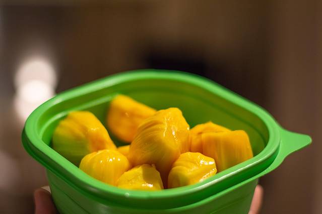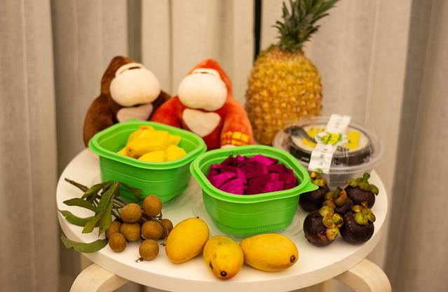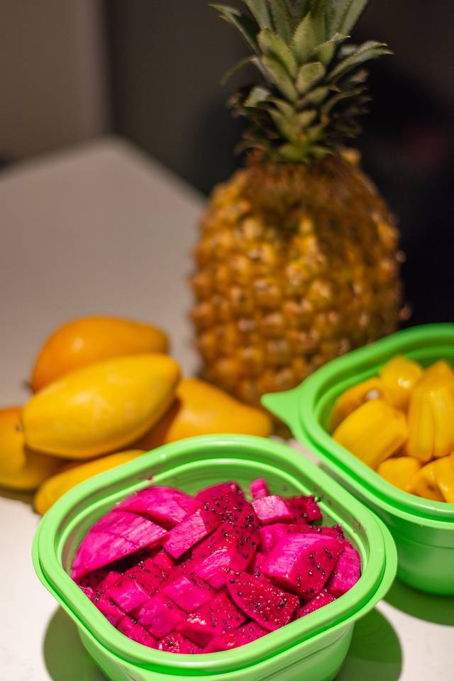 满满的一大袋,两个人提都有点小重。我们一共点了凤梨、芒果、山竹、火龙果、龙岩、菠萝蜜和椰子冻。大大的袋子里除了各色水果,还有一次性手套和水果刀,应该是给我们切凤梨的。