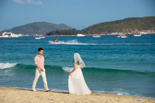 从我们入住的亚龙湾迎宾馆去步行去海滩之需要10分钟左右,在傍晚日落之前走去沙滩,暑气早已散去,海风海开始轻柔的拂向人群,这个时候去沙滩上散散步才是最合适的。