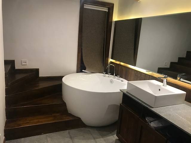 晚上就住在了岛上,前一天爬泸山爬的小腿疼,今天终于可以好好休息一天了,房间里有浴缸,不过我没有用,烫了几遍之后老公一个人泡了澡