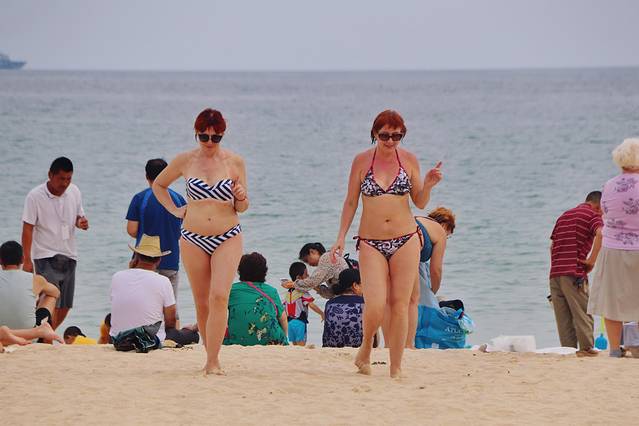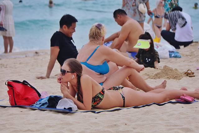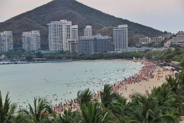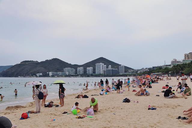 大东海海滩很受外国人欢迎,这里常常见到穿比基尼的外国人来晒日光浴。