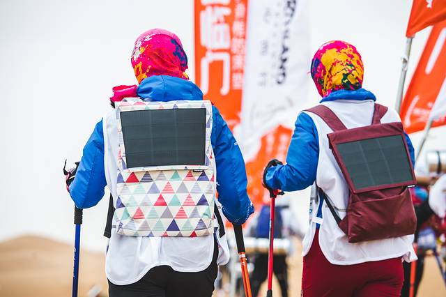 这其实是汉能独有的薄膜太阳能芯片附着在背包上,太阳光照射后可以转化为电能。