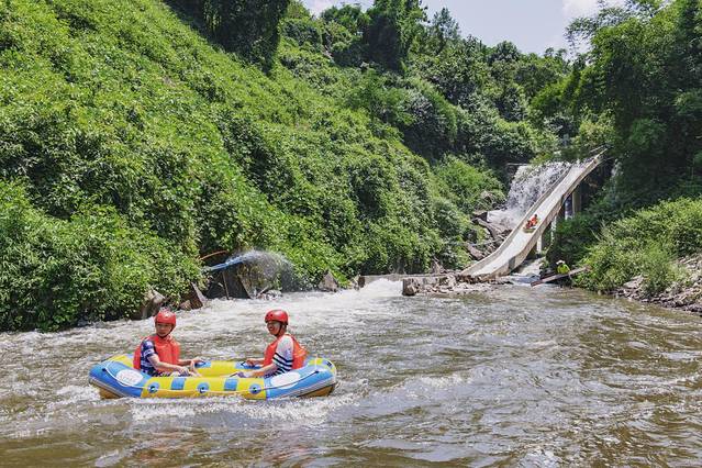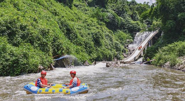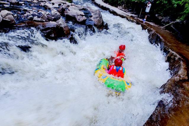 龙浒峡依托龙岗大型水库外加自建的水库,形成了上游最大高度15米的落差,被称为“猛士河段”。连续激流勇及一千多米,耳旁尖叫声不断,让你从另类角度充分体验山水重庆的回旋激荡。在也只有在这里,你被湍流高高托举,眼前只有被龙浒峡谷围绕的一方蓝天和不停往脸上拍打的水花,凉意十足,酣畅淋漓。