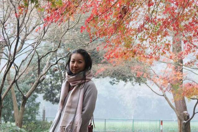 一路上人很少,枫叶已经没那么红了,小仙女还是很满足,拍了好多好多,路过一个小区,好看的荷花,小仙女这飞扬的表情,好美好美,跟荷花交相辉映。