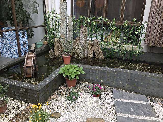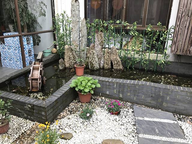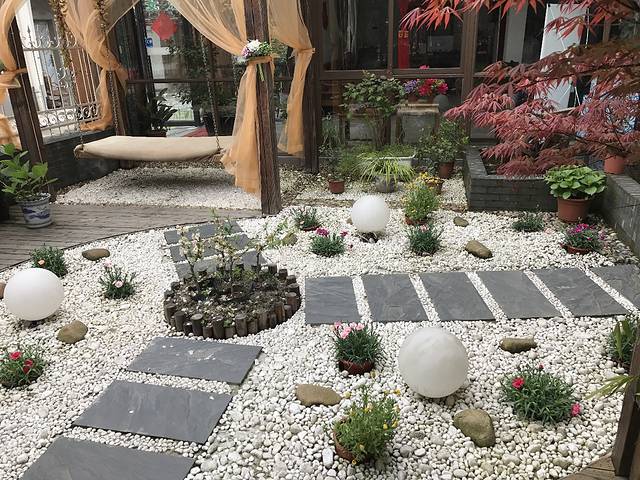 有个秋千,拍照特别好看。庭院里大大的鹅卵石和漂亮的圆灯,到了晚上是最好看的时候。