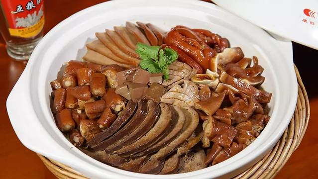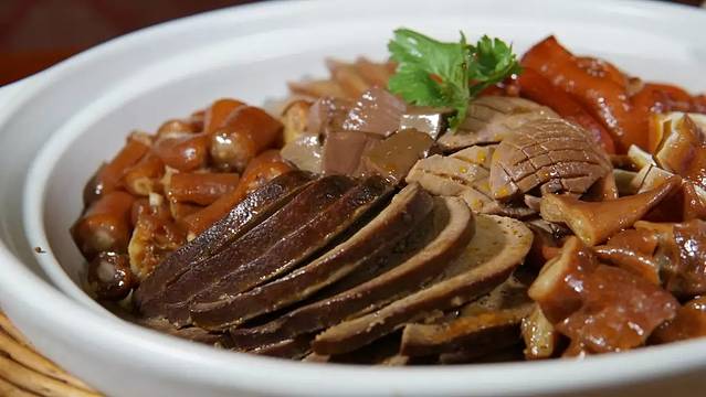 而里面装满了猪的各个部位,一共是八样:猪耳朵、猪大肠、猪尾巴、猪腰、猪脚、猪血、猪舌头和猪肝。