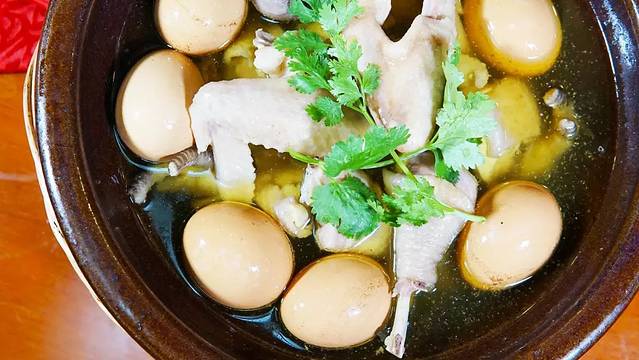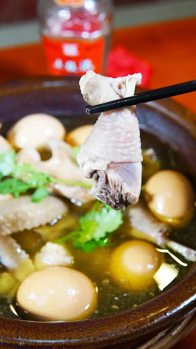 土鸡煲里还围绕着一圈土鸡蛋,这些土鸡蛋都是带壳一起蒸的。师傅说,随着时间的推移,鸡蛋壳会慢慢破裂,鸡汤的鲜味和鸡肉的香味都会从裂痕中渗透进去,这样的一颗鸡蛋简直不敢想象会有多入味多美味!
