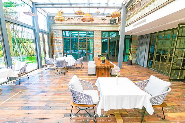 因为我到的时候正值中午,一路的赶车早已是饥肠辘辘了。于是也没有急着到房间办理入住,先到阳光餐吧里享用一顿午餐再说。阳光餐吧可以说是一个沐浴阳光的好地方,全玻璃结构的外墙、木制的地板、简约的餐桌,外面水车潺潺、游鱼翱翔,可以说是现代与古典的完美结合。