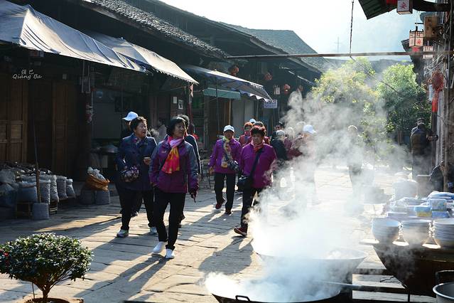 早上古镇内卖早点的店铺门前,热气腾腾。