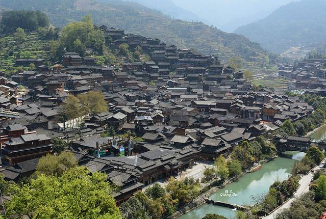 千户苗寨,地处黔东南苗族侗族自治州雷山县西江镇,自治州的州府为凯里市(县级市),故苗寨称为凯里西江千户苗寨。